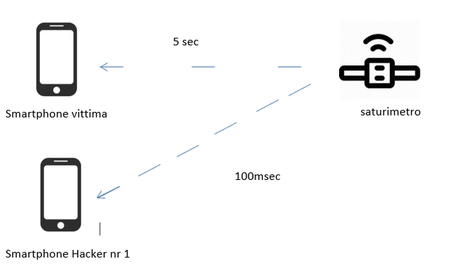 L’attaccante innanzitutto si vorrebbe assicurare del fatto che il saturimetro non dovrà rispondere più all’applicazione android dello smartphone vittima, per far ciò utilizzerà uno smartphone hacker nr 1 impostato con un delay minore di scansione, all’incirca ogni 100 msec rispetto al delay dello smartphone vittima di 5 sec. Questa situazione si tradurrà in questo modo: all’accensione del dispositivo saturimetro lo smartphone hacker nr 1 avrà una probabilità maggiore di rilevare i pacchetti di adversiting inviati dal saturimetro rispetto alla probabilità dello smartphone vittima.